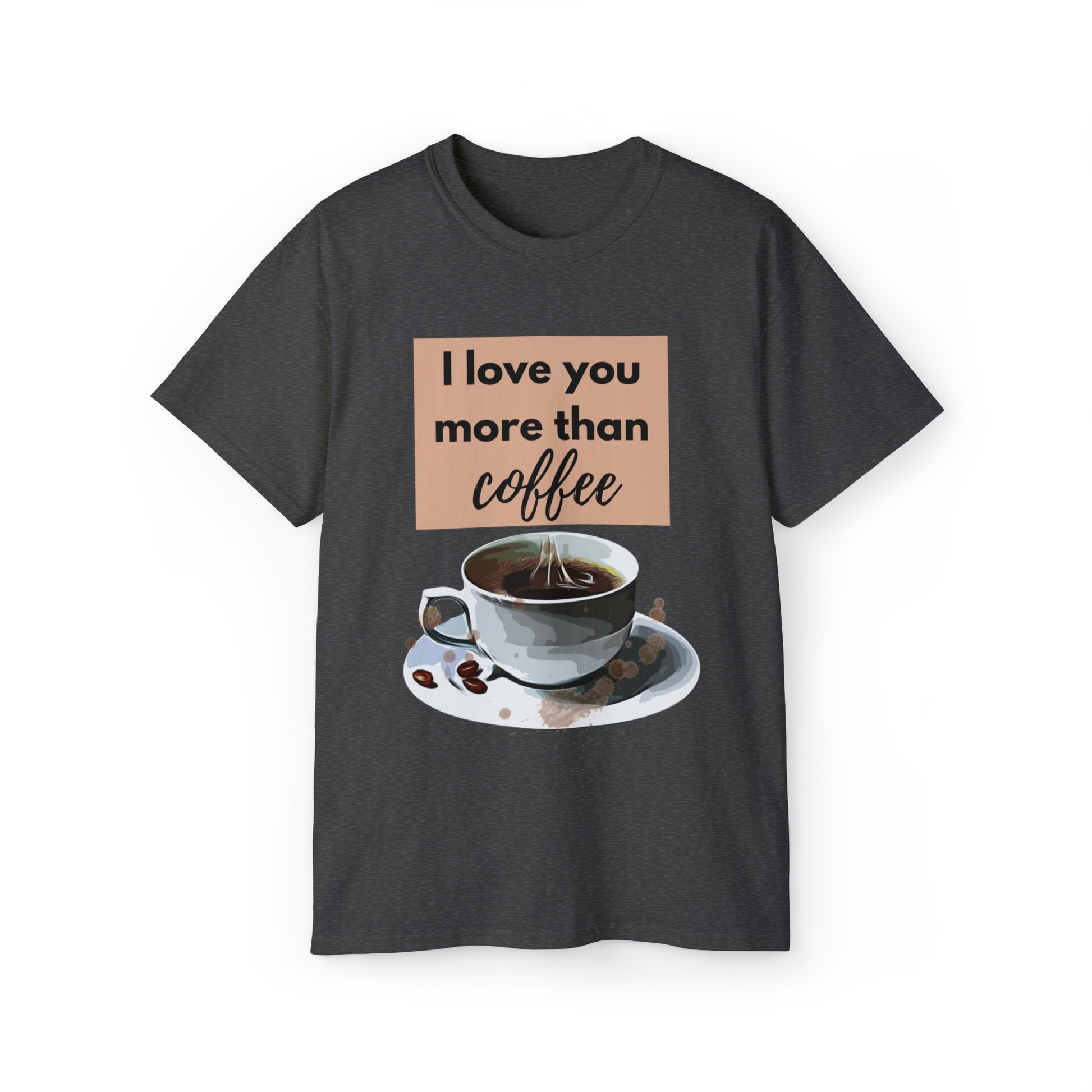 This unisex ultra cotton tee is a classic. The shoulders are tapped for a good upper-body fit. There are no side seams, ensuring a clean, unbroken flow. The collar has ribbed knitting for improved elasticity. The materials that went into this product are sustainably sourced and economically friendly. Have you seen those shirts or posts people make saying how obsessed they are with coffee or that they "can't live without it." Well I created this design as a funny joke saying "I love you more than coffee", so if you love coffee and your spouse does too this would be a funny matching outfit choice for you both!